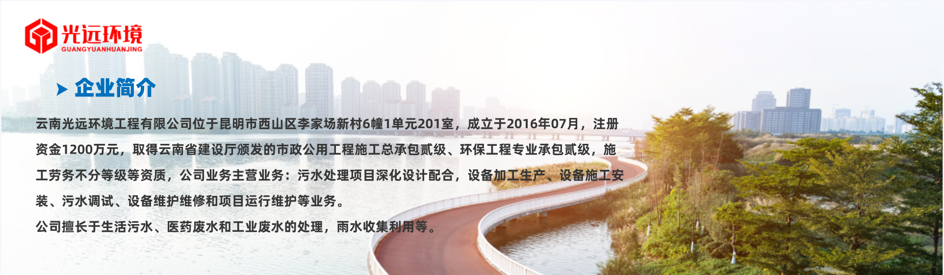 云南光遠(yuǎn)環(huán)境工程有限公司位于昆明市西山區(qū)李家場(chǎng)新村6幢1單元201室,成立于2016年07月,注冊(cè)資金1200萬(wàn)元,取得云南省建設(shè)廳頒發(fā)的市政公用工程施工總承包貳級(jí)、環(huán)保工程專(zhuān)業(yè)承包貳級(jí),施工勞務(wù)不分等級(jí)等資質(zhì),公司業(yè)務(wù)主營(yíng)業(yè)務(wù):污水處理項(xiàng)目深化設(shè)計(jì)配合,設(shè)備加工生產(chǎn)、設(shè)備施工安裝、污水調(diào)試、設(shè)備維護(hù)維修和項(xiàng)目運(yùn)行維護(hù)等業(yè)務(wù)。,擁有專(zhuān)業(yè)建技術(shù)工程師5人,建造師3的,項(xiàng)目管理人員若干,累計(jì)完成50多個(gè)項(xiàng)目,成為五家500強(qiáng)企業(yè)合作伙伴,為多個(gè)客戶(hù)解決水污染治理的難題。